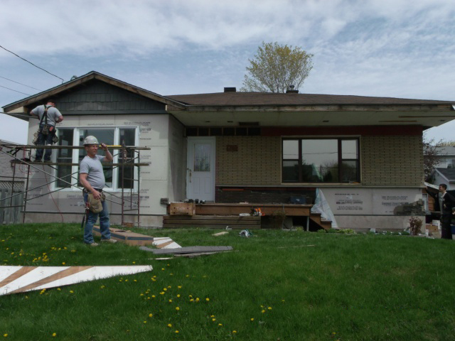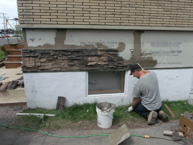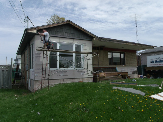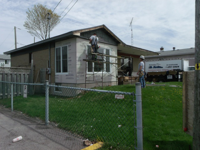 Installation d’une pierre extérieure, canexel , porte et fenêtres.